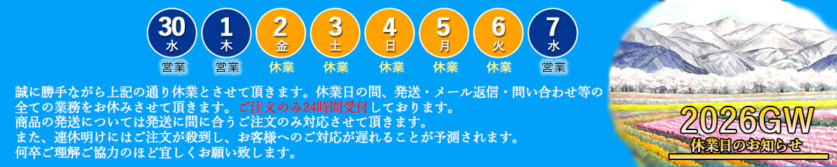 【お知らせ】5/2~5/6までGW休業となります。ご注文のみ24時間受付、その他の業務は全てお休みさせていただきます。