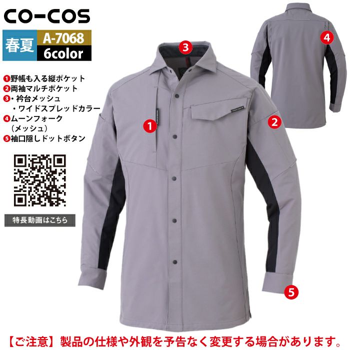 コーコス 作業服 オールシーズン A-7068 ストレッチ長袖シャツ 4L-6L