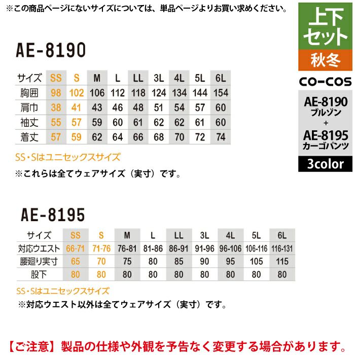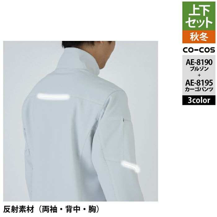 コーコス 作業服 上下セット AE-8190 エコ裏綿ストレッチブルゾンSS-3L と AE-8195 エコ裏綿ストレッチカーゴパンツ SS-3L 作業着 作業ズボン 秋冬用