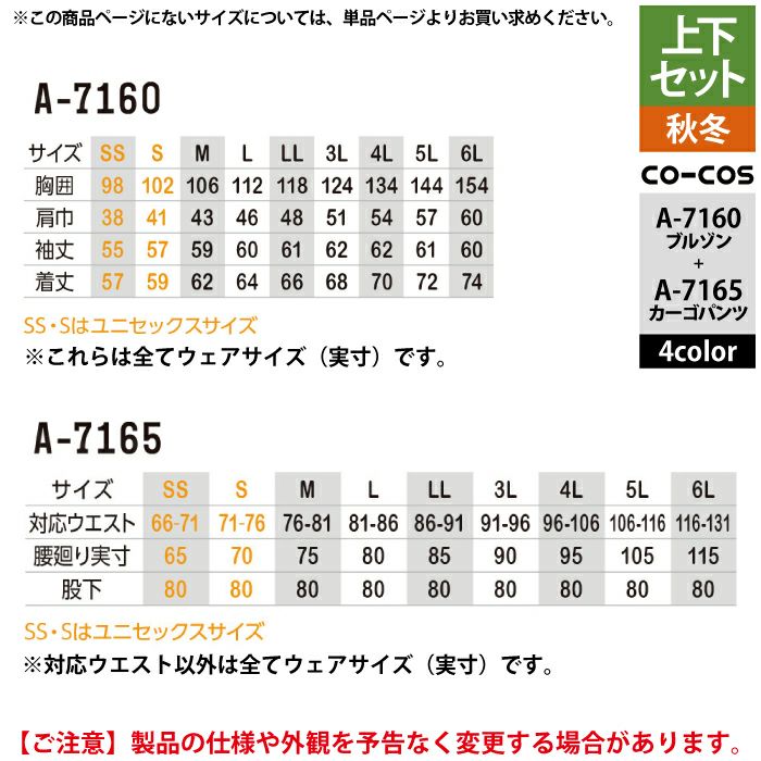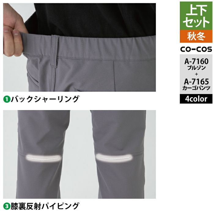 コーコス 作業服 上下セット A-7160 ストレッチブルゾンS-3L と A-7165 ストレッチカーゴパンツ SS-3L 作業着 作業ズボン 秋冬用