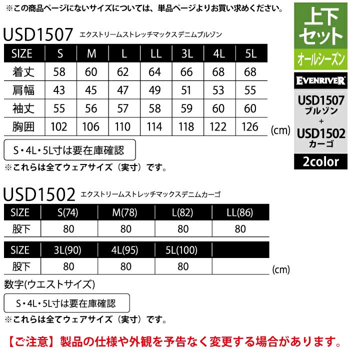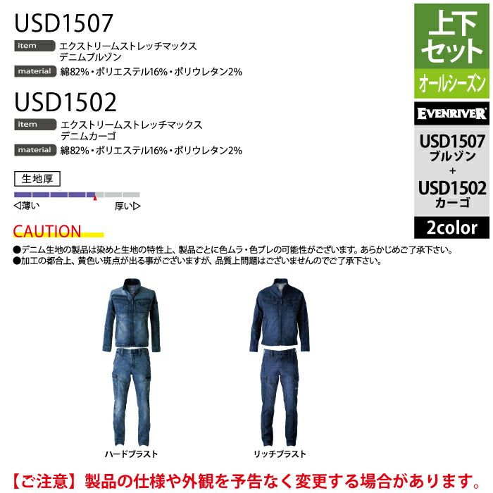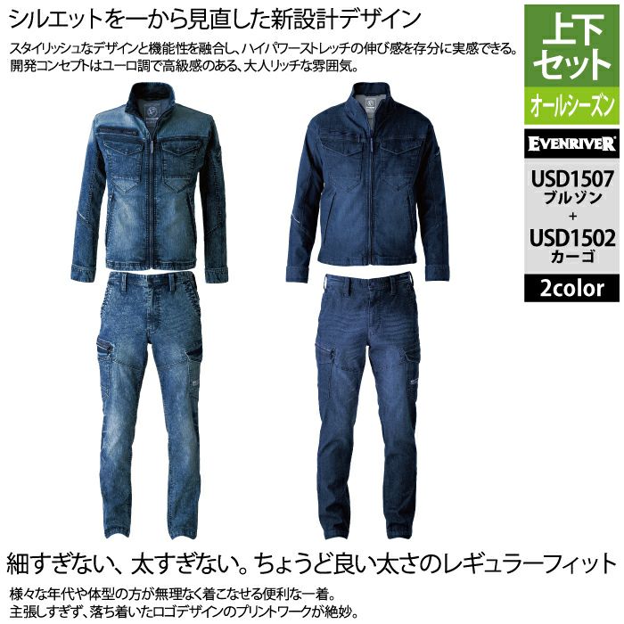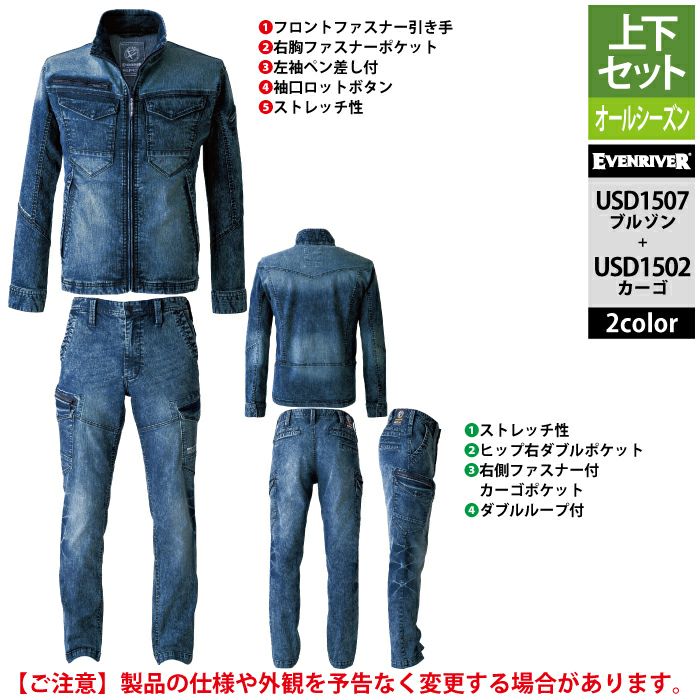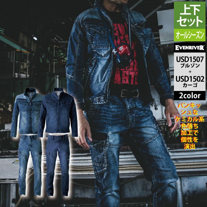 イーブンリバー 作業服 作業着 上下セット イーブンリバー EVENRIVER 作業服 上下セット USD1507 ストレッチデニムブルゾンS-3L と USD1502 ストレッチデニムカーゴ S-3L 作業着 作業ズボン