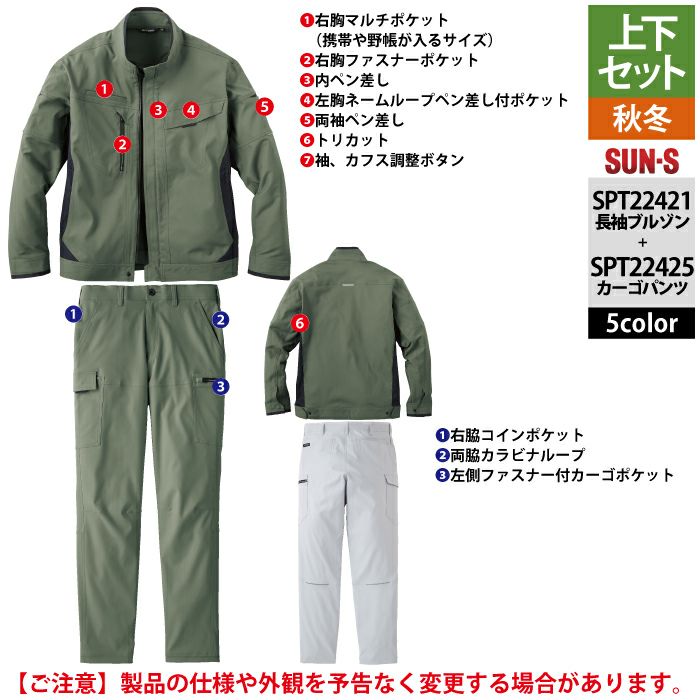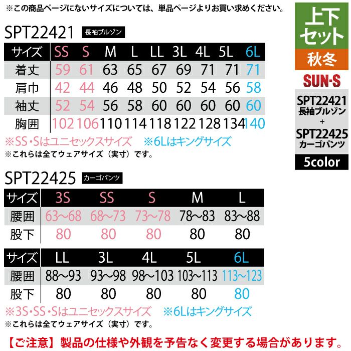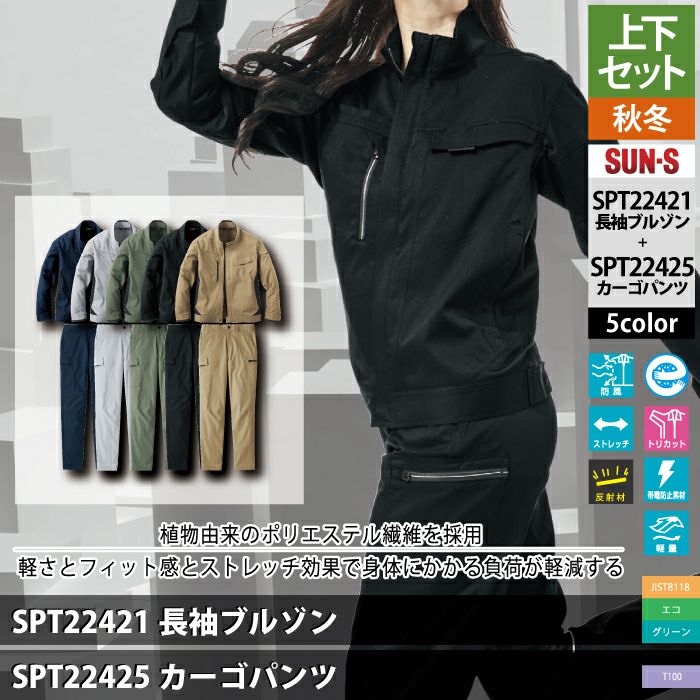 サンエス 作業服 上下セット SPT22421 長袖ブルゾンM-3L と SPT22425 カーゴパンツ 3S-3L 秋冬 作業ズボン 作業着