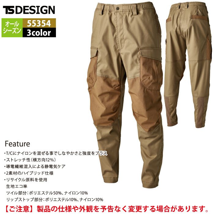 ◇機能:カーゴポケット・バックポケット・ふくらはぎリブ・ウエストゴム・リサイクル原料を使用(製品エコ率40%)・ストレッチ性(横方向12%)・導電繊維混入による静電気ケア・2素材のハイブリッド仕様