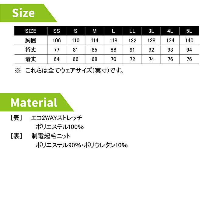 ◇機能:動きやすい2wayストレッチ・撥水加工・フロント止水ファスナー・両胸両脇止水ファスナーポケット・JIS T8118帯電防止作業服適合商品・裏地は制電起毛ニットで静電気を抑え 更に保温性アップ・裾ゴムスピンドルで調整可能・袖口面ファスナーで調整可能・左袖に反射材プリント・袖口 後ろ裾に反射材付・フードはアジャストストッパー付(取外し可能 ヘルメット対応)