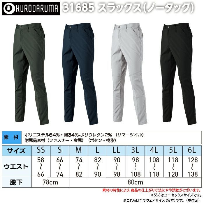 作業服 作業着 作業ズボン クロダルマ 作業服 作業ズボン 31685 スラックス(ノータック) 6L 春夏用