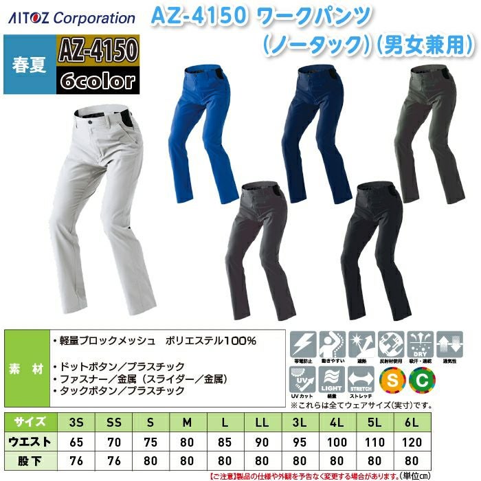 アイトス Aitoz 作業服 作業着 作業ズボン アイトス 作業服 作業着 Aitoz 春夏用 Aitoz AZ-4150 ワークパンツ(ノータック)(男女兼用) 6L