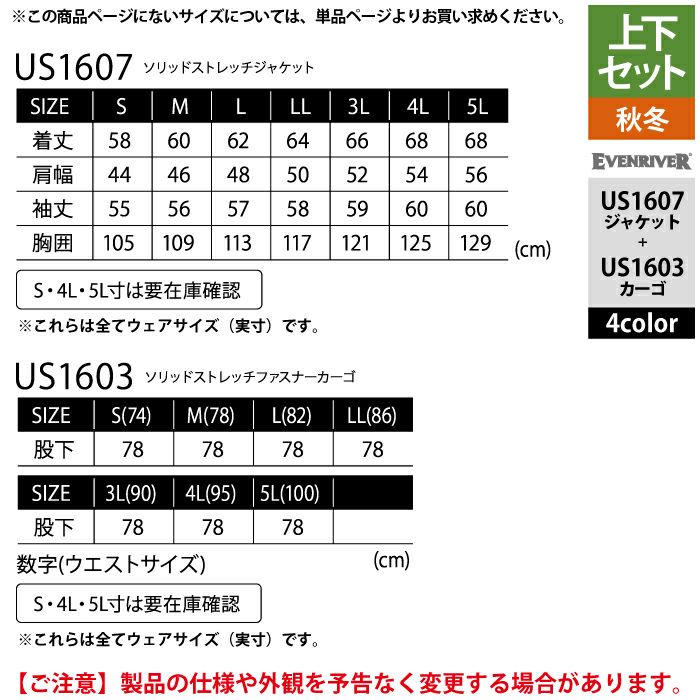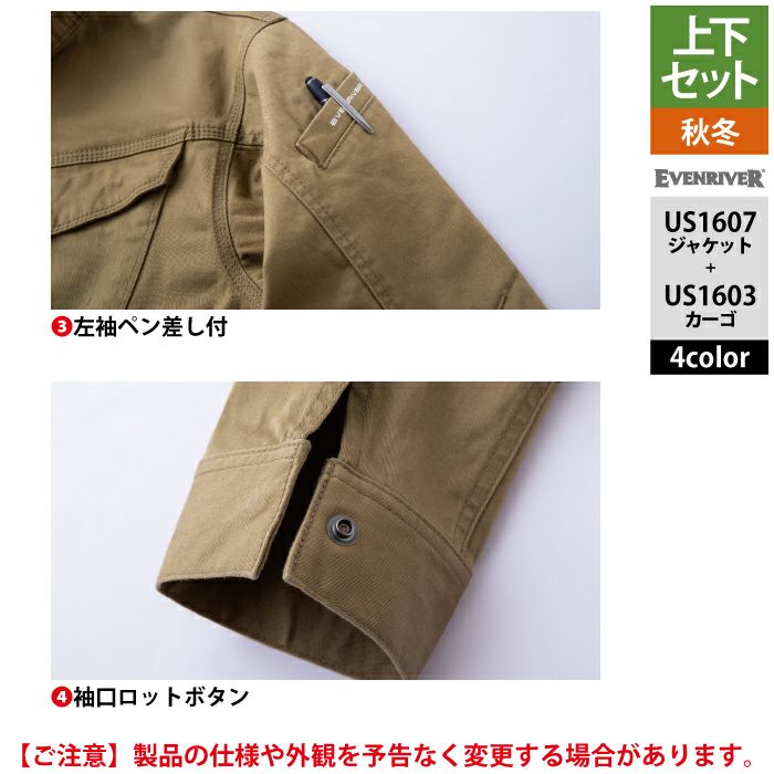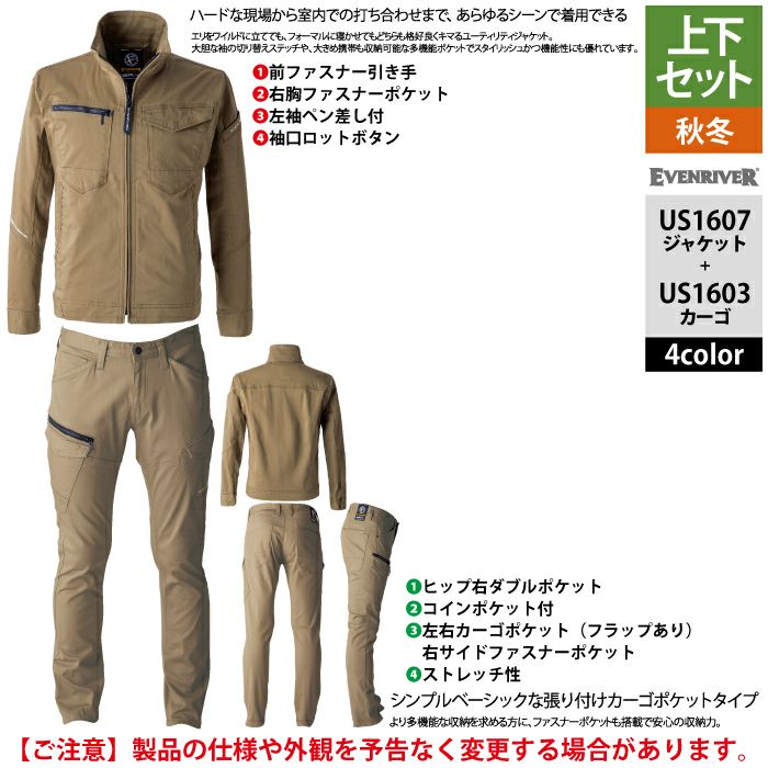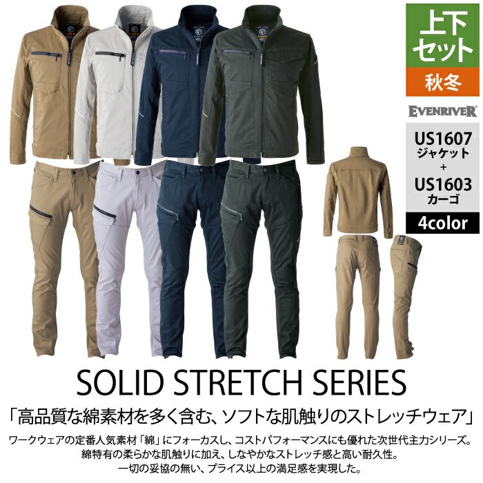 イーブンリバー EVENRIVER 作業服 上下セット US1607 ストレッチジャケットS-3L と US1603 ストレッチファスナーカーゴ S-4L 作業着 作業ズボン