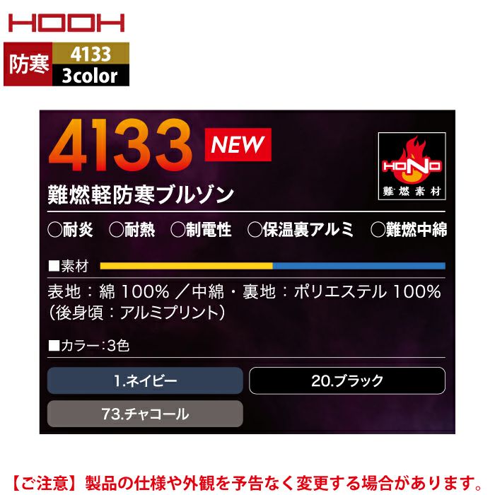 村上被服 HOOH 鳳凰 作業服 作業着 村上被服 HOOH 鳳凰 作業服 防寒着 4133 難燃軽防寒ブルゾン M-3L 秋冬 作業着 おしゃれ 難燃 耐熱 制電 保温