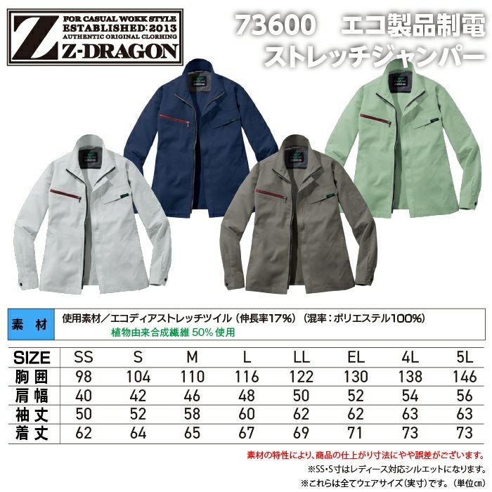 自重堂 作業服 作業着 自重堂 Z-DRAGON ジードラゴン 作業服 73600 エコ製品制電ストレッチジャンパー EL 秋冬 作業着
