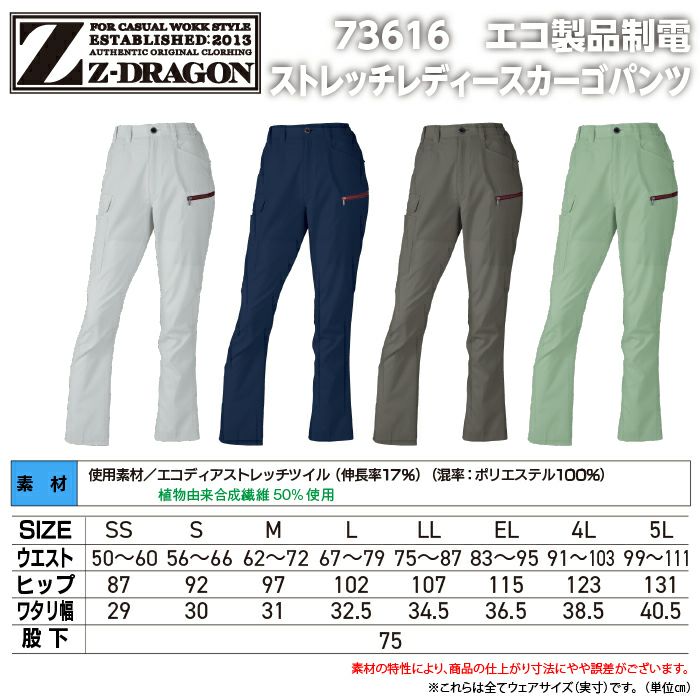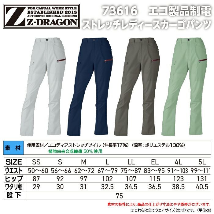 自重堂 作業服 作業着 自重堂 Z-DRAGON ジードラゴン 作業服 73616 エコ製品制電ストレッチレディースカーゴパンツ EL 秋冬 作業着