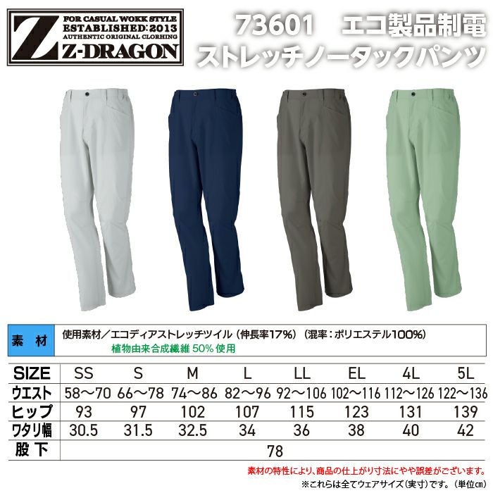 自重堂 作業服 作業着 自重堂 Z-DRAGON ジードラゴン 作業服 73601 エコ製品制電ストレッチノータックパンツ EL 秋冬 作業着