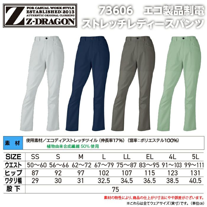 自重堂 作業服 作業着 自重堂 Z-DRAGON ジードラゴン 作業服 73606 エコ製品制電ストレッチレディースパンツ EL 秋冬 作業着