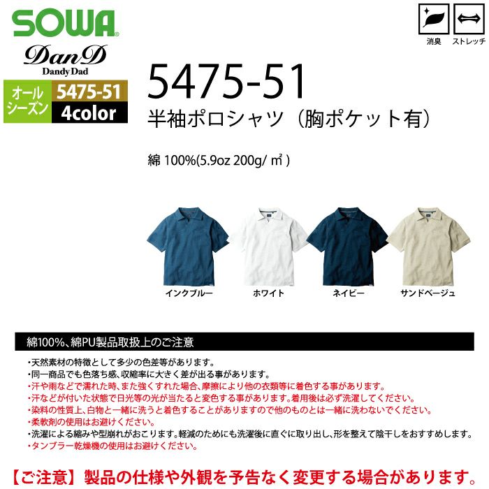 作業服 作業着 秋冬用 桑和 SOWA 作業服 5475-51 半袖ポロシャツ S-3L オールシーズン 作業着 ソーワ ワークウェア