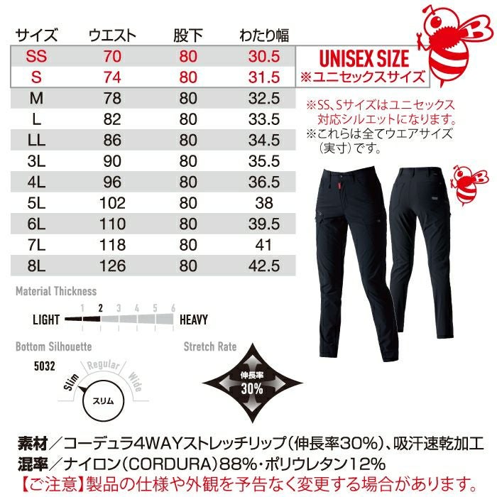 耐久性 ユニセックス 吸汗速乾 バートル BURTLE 作業着 作業ズボン 2025春夏新作 5032 カーゴパンツ SS-3L 作業服 おしゃれ コーデュラ 接触冷感