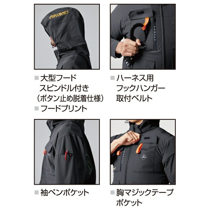 ◇ヘルメット収納フード(着脱可能)・フックハンガー・背ランヤードホールを配備しフルハーネスに完全対応