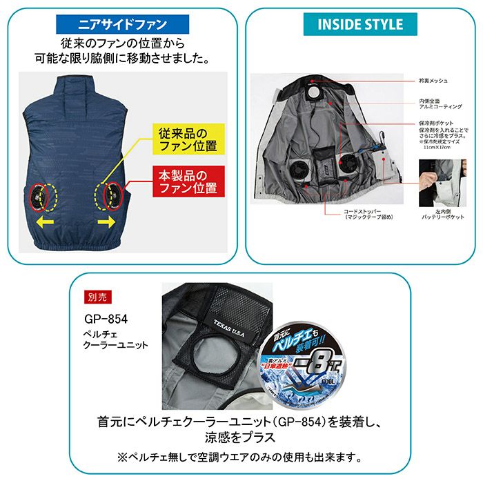 ◇機能:ニアサイドファン・衿台メッシュ 衿ワイヤー入り・背中風気路・裾ずり上がり防止ループ・保冷剤ポケット1箇所・商脇ポケット・左内側バッテリーポケット