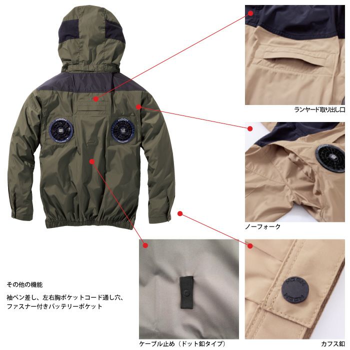 ◇機能:ロゴ入りフロントファスナー・左胸二重ポケット・フードストレッチパイピン・耳部分綿冷感コンプレッション・ダクト・左胸プリントファスナー・フード取り外し・ノーフォーク・カフス釦・ケーブル止め・袖ペン差し・左右胸ポケットコード通し穴・ファスナー付きバッテリーポケット