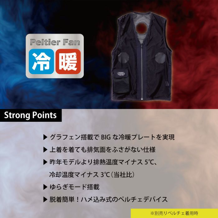 ◇機能:ロゴ入りフロントファスナー・マジックテープ付きバッテリーポケット・ケーブル通し穴・アームホール裾ニットパイピングゴム・ペルチェ取り付け口・ケーブル止め4箇所・右脇ケーブル通しゴム・フリーストレッチフロントメッシュ