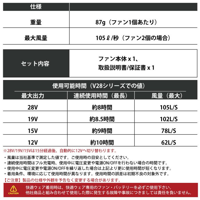 ◇連続使用可能時間:最大出力・連続使用時間・風量:28V・約8時間・105L/S:19V・約8.5時間・102L/S:15V・約9時間・78L/S:12V・約10時間・62L/S