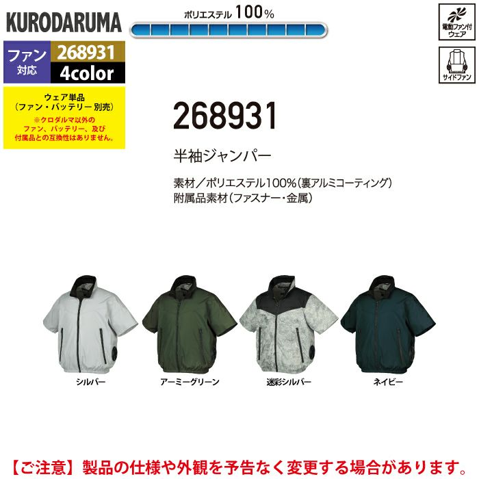 ファン付きウェア (服のみ) クロダルマ 作業服 春夏 268931 半袖ジャンパー 7L 作業着