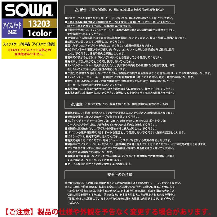 ファン付きウェア 桑和 SOWA 作業服 13203 スイッチケーブル F 作業着 オールシーズン