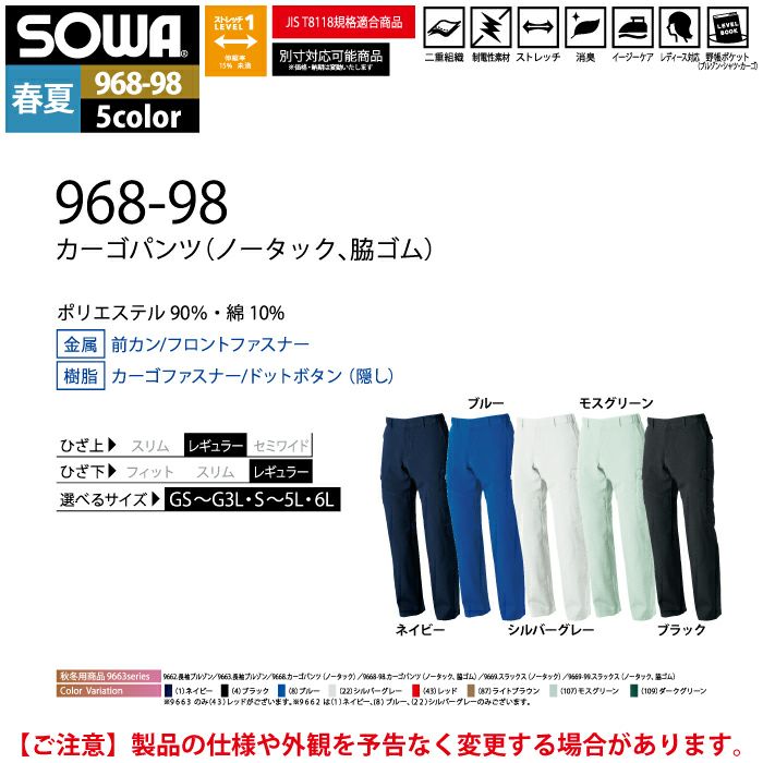 桑和 SOWA 作業服 作業着 作業ズボン 桑和 SOWA 作業服 作業ズボン 968-98 カーゴパンツ 4L 作業着 春夏