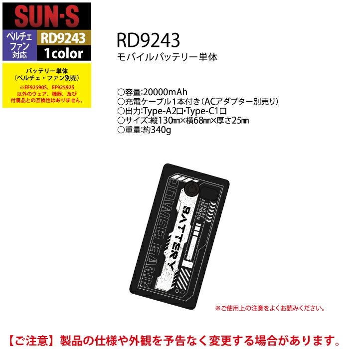 ペルチェ対応ウェア サンエス 作業服 春夏 RD9243 モバイルバッテリー単体 F 作業着