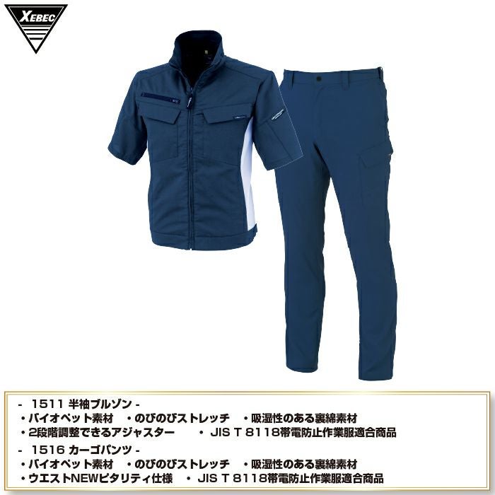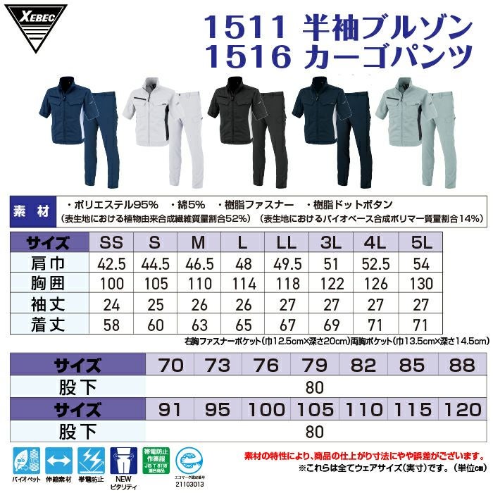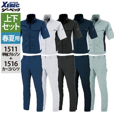 ジーベック XEBEC 作業服 上下セット 春夏 1511 半袖ブルゾンM-3L と 1516 ピタリティカーゴパンツ 70-100 作業ズボン 作業着