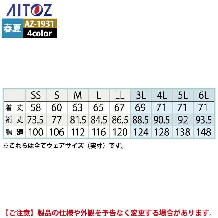 作業服 作業着 アイトス Aitoz 作業服 AZ-1931 長袖ブルゾン 6L 春夏用