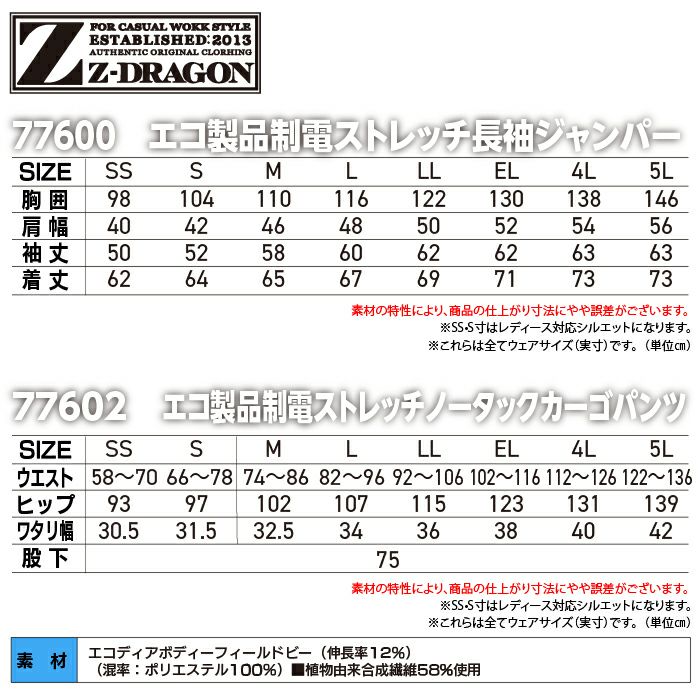 自重堂 作業服 作業着 自重堂 作業服 上下セット Z-DRAGON 春夏 77600 エコ製品制電ストレッチ長袖ジャンパー と 77602 エコ製品制電ストレッチノータックカーゴパンツ