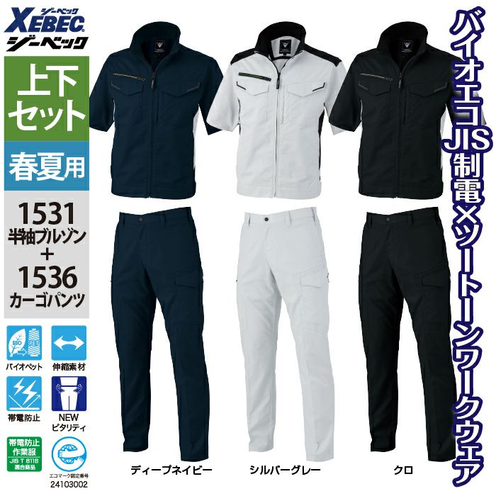 ジーベック 作業服 作業着 ジーベック XEBEC 作業服 上下セット 春夏 1531 半袖ブルゾンSS-3L と 1536 ピタリティカーゴパンツ 70-100 作業ズボン 作業着