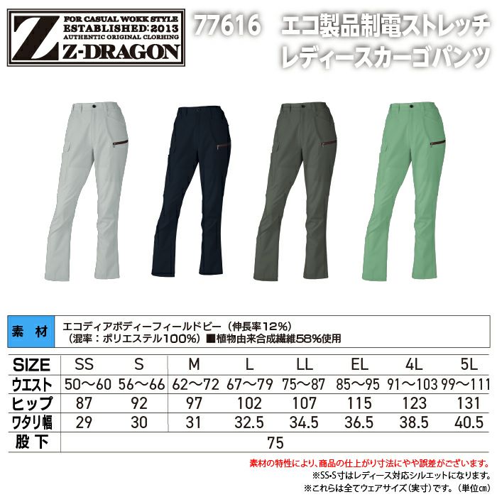 自重堂 作業服 作業着 自重堂 Z-DRAGON ジードラゴン 作業服 春夏 77616 エコ製品制電ストレッチレディースカーゴパンツ(裏付) SS-LL 作業ズボン 作業着