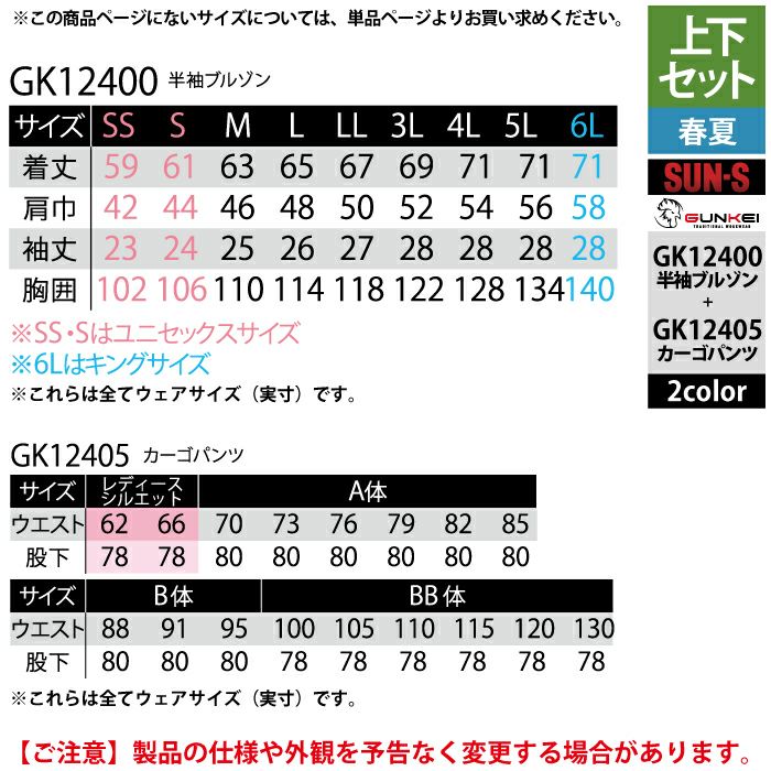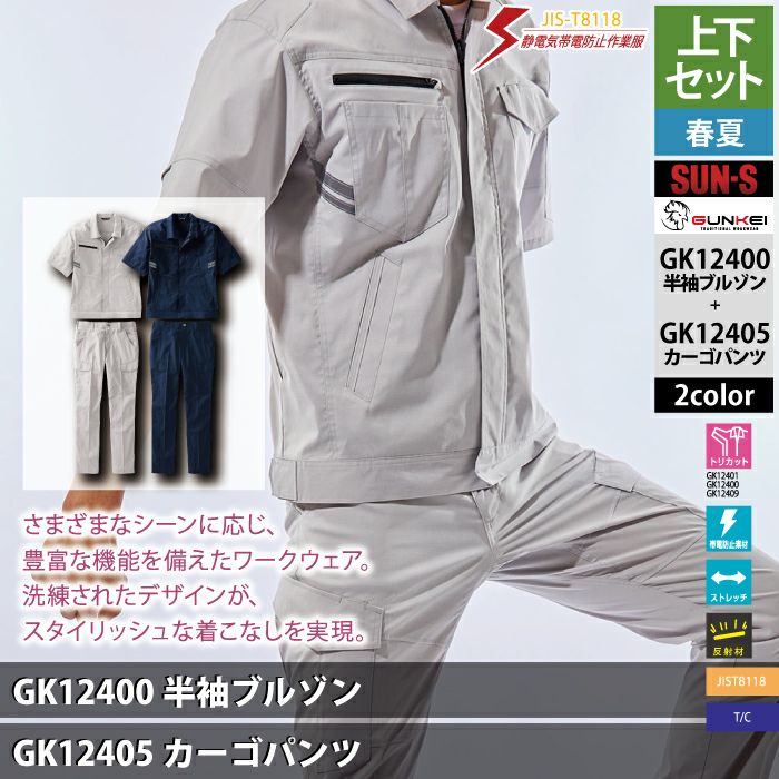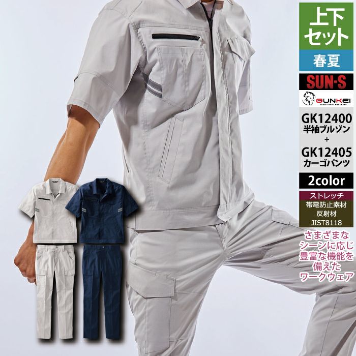 サンエス 作業服 作業着 サンエス 作業服 上下セット 春夏 GK12400 半袖ブルゾンSS-3L と GK12405 カーゴパンツ 62-100 作業ズボン 作業着
