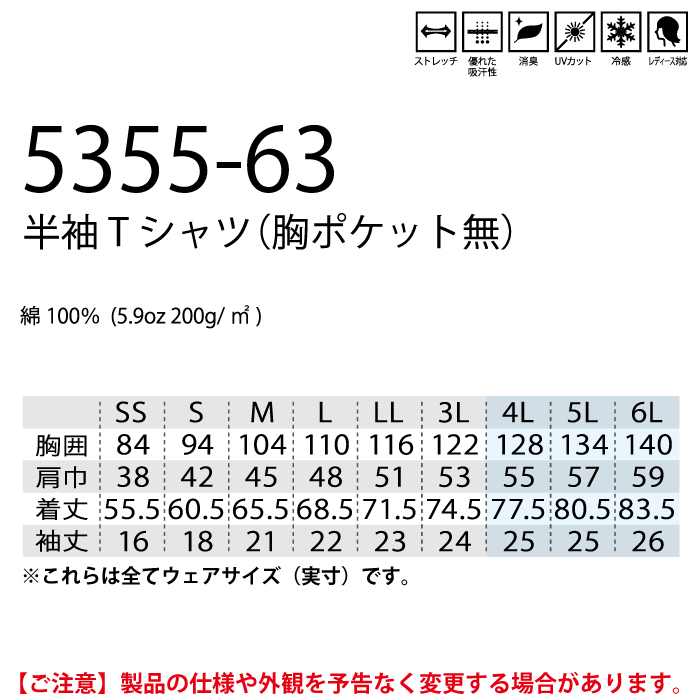 桑和 作業服 作業着 桑和 SOWA 作業服 5355-63 半袖Tシャツ(胸ポケット無) 5L 春夏用 作業着 ソーワ ワークウェア