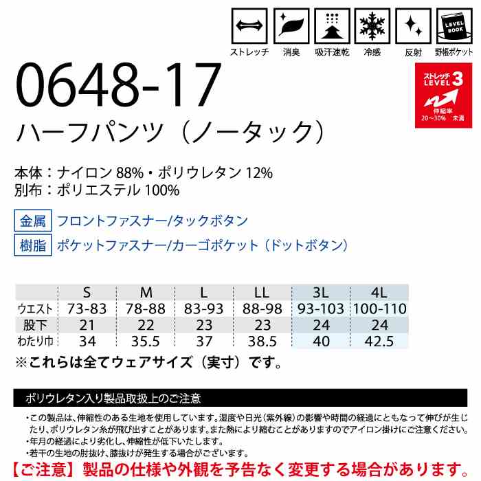 桑和 作業服 作業着 桑和 SOWA 作業服 0648-17 ハーフパンツ(ノータック) 3L 春夏用 作業着 ソーワ ワークウェア