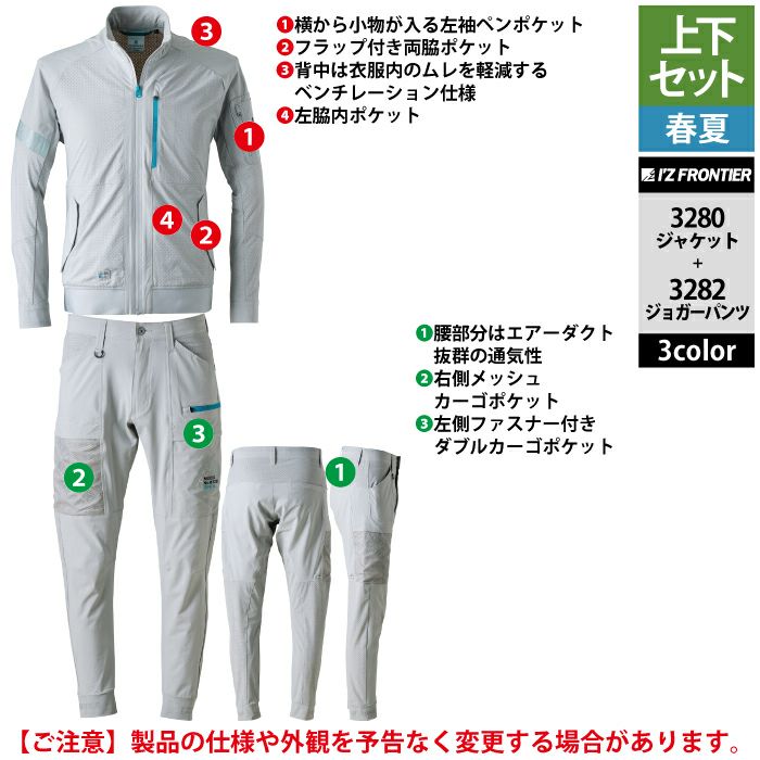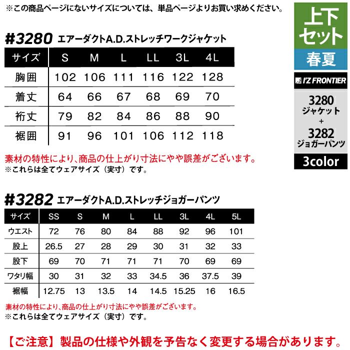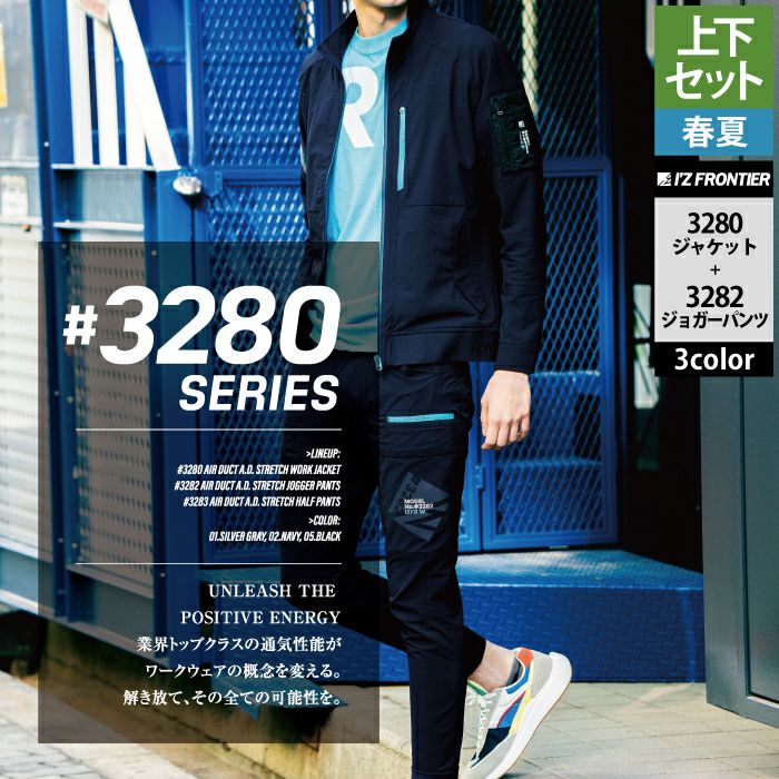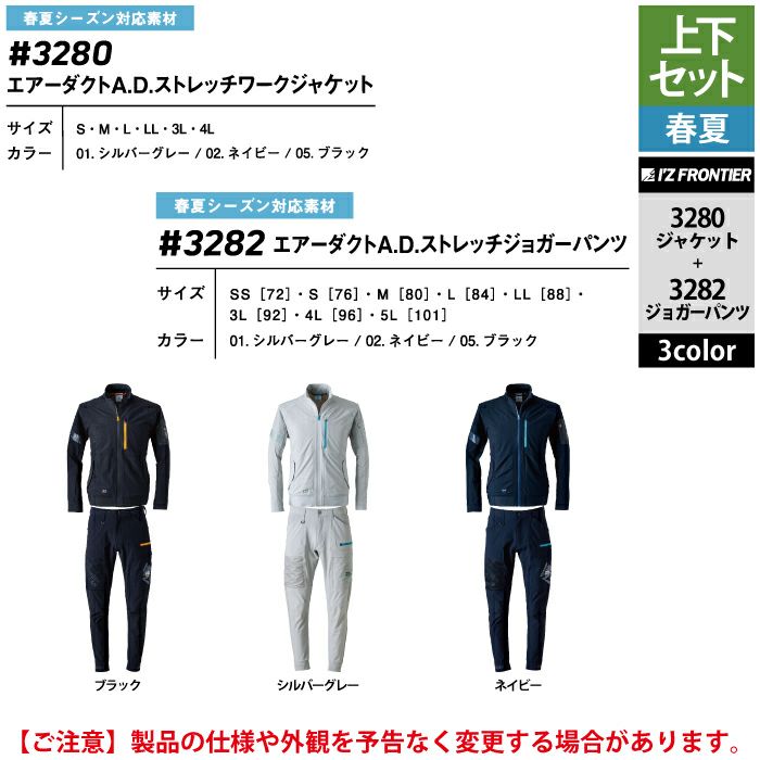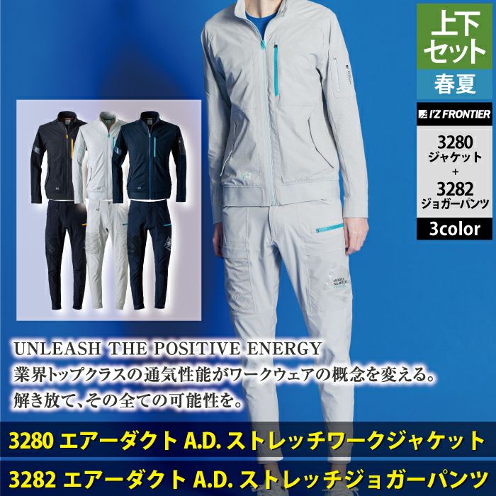 アイズフロンティア 作業服 作業着 上下セット アイズフロンティア 作業服 上下セット 3280 エアーダクトADストレッチワークジャケットS-3L と 3282 エアーダクトADストレッチジョガーパンツ SS-3L 春夏用