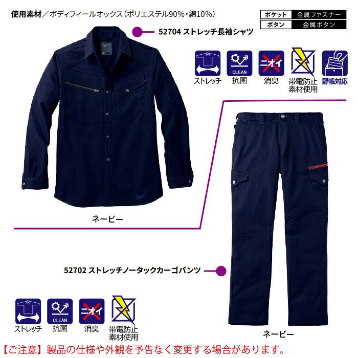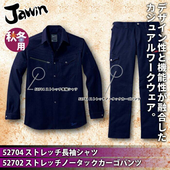 自重堂 JAWIN ジャウィン 作業服 作業着 自重堂 JAWIN ジャウィン 作業服 上下セット 52704 ストレッチ長袖シャツ と 52702 ストレッチノータックカーゴパンツ S-LL 秋冬用 作業着