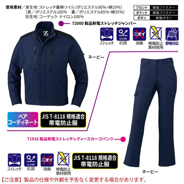 自重堂 作業服 作業着 作業ズボン 自重堂 作業服 上下セット 72000 製品制電ストレッチジャンパー と 72016 製品制電ストレッチレディースカーゴパンツ SS-LL オールシーズン おしゃれ 作業着