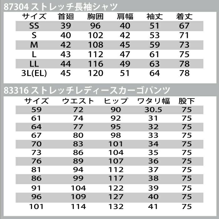 自重堂 作業服 作業着 作業ズボン 自重堂 作業服 上下セット 87304 ストレッチ長袖シャツ と 83316 ストレッチレディースカーゴパンツ SS-LL 秋冬用 かっこいい おしゃれ 作業着