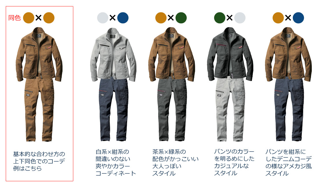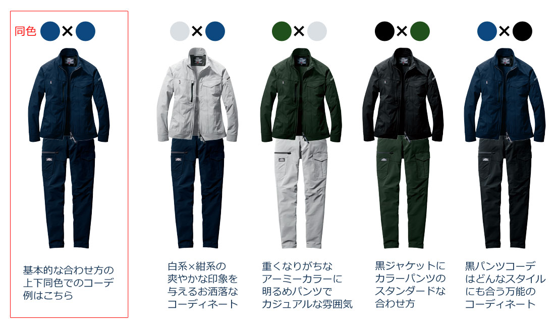上下で別色に合わせた作業服の選択肢を広げる組み合わせ特集です