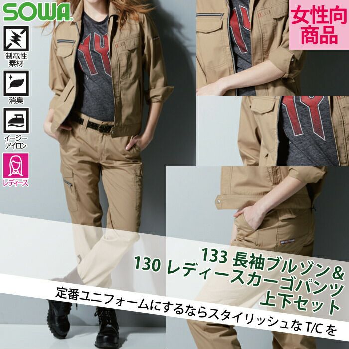 桑和 SOWA 作業服 作業着 作業ズボン 桑和 SOWA 作業服 上下セット 133 長袖ブルゾンSS-3L と 130 レディースカーゴパンツ GS-LL 春夏用 かっこいい おしゃれ 作業着 ズボン