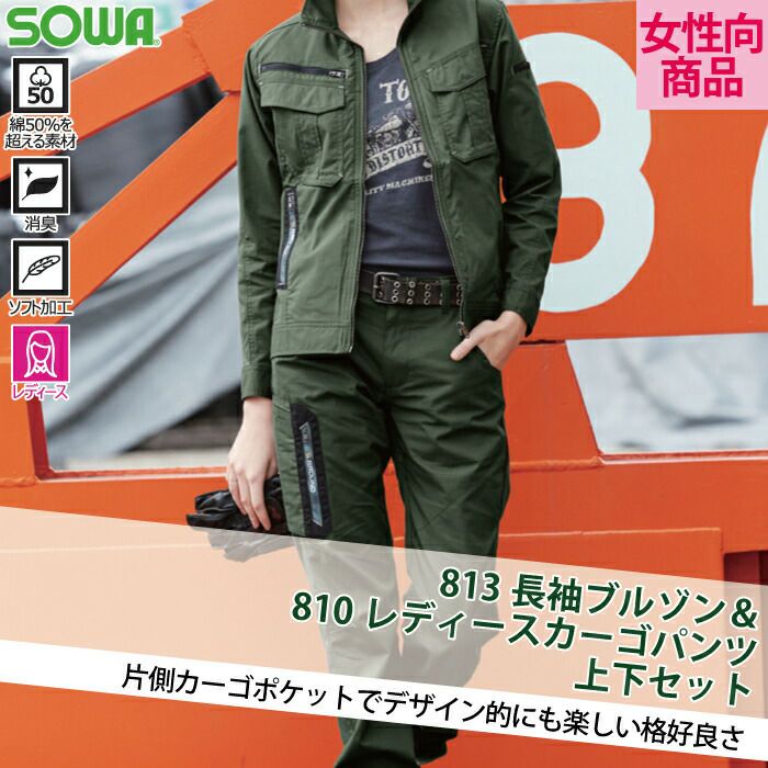 桑和 SOWA 作業服 作業着 作業ズボン 桑和 SOWA 作業服 上下セット 813 長袖ブルゾンSS-3L と 810 レディスカーゴパンツ GS-GL 春夏用 かっこいい おしゃれ 作業着 ズボン