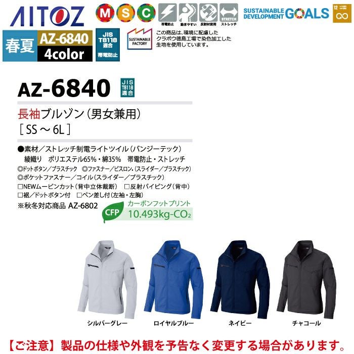 作業服 作業着 アイトス Aitoz 作業服 AZ-6840 長袖ブルゾン SS-LL 春夏用