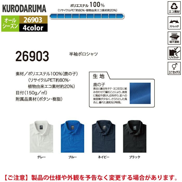 作業服 作業着 春夏 クロダルマ 作業服 春夏 26903 半袖ポロシャツ 3L-5L 作業着