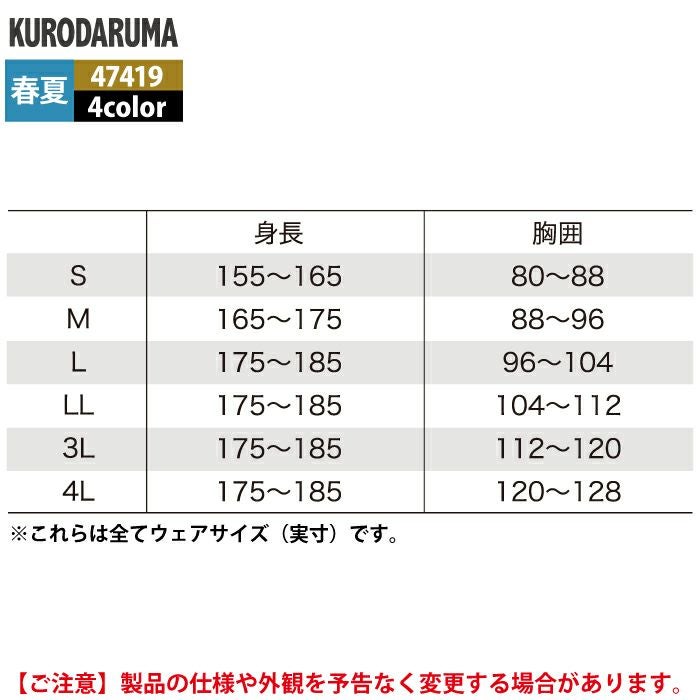 作業服 作業着 春夏 クロダルマ 作業服 春夏 47419 長袖アンダーレイヤー 3L-4L インナー 作業着