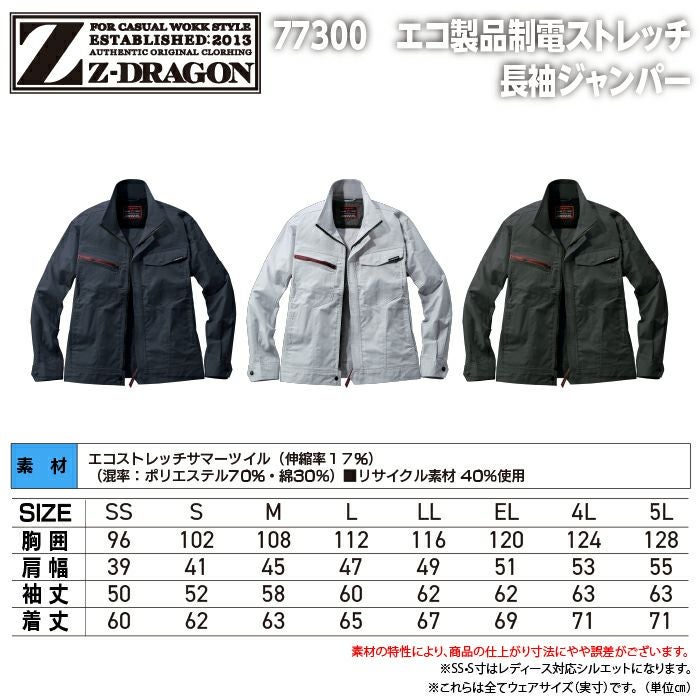 自重堂 作業服 作業着 自重堂 Z-DRAGON ジードラゴン 作業服 春夏 77300 エコ製品制電ストレッチ長袖ジャンパー SS-LL 作業着
