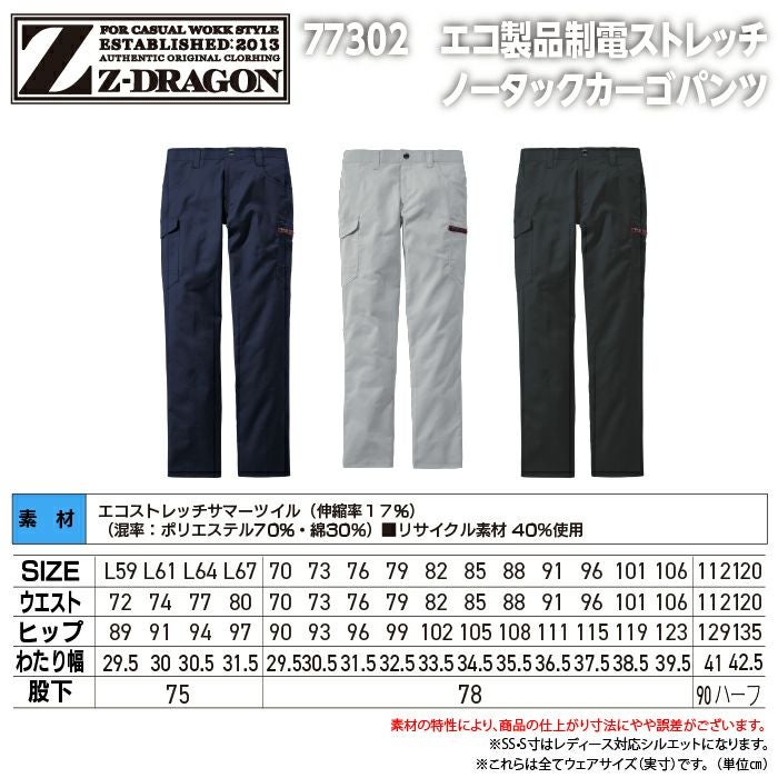 自重堂 作業服 作業着 自重堂 Z-DRAGON ジードラゴン 作業服 春夏 77302 エコ製品制電ストレッチノータックカーゴパンツ L59-88 作業ズボン 作業着