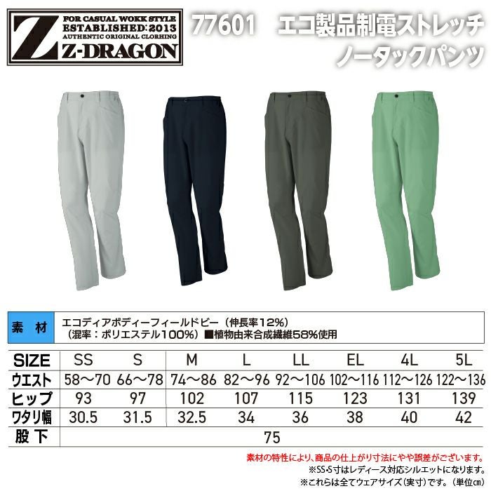 自重堂 作業服 作業着 自重堂 Z-DRAGON ジードラゴン 作業服 春夏 77601 エコ製品制電ストレッチノータックパンツ EL 作業ズボン 作業着