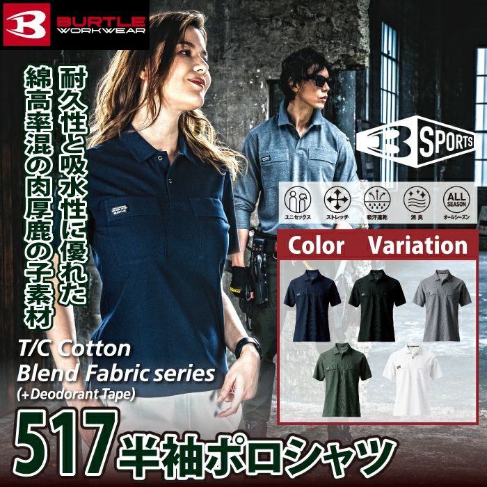 ユニセックス 吸汗速乾 鹿の子 バートル BURTLE 作業着 インナー 2025春夏新作 517 半袖ポロシャツ S-3L 作業服 おしゃれ ドライ 消臭 シャツ