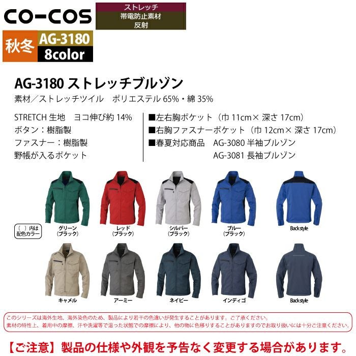作業服 作業着 コーコス 作業服 秋冬用 AG-3180 ストレッチブルゾン SS-LL